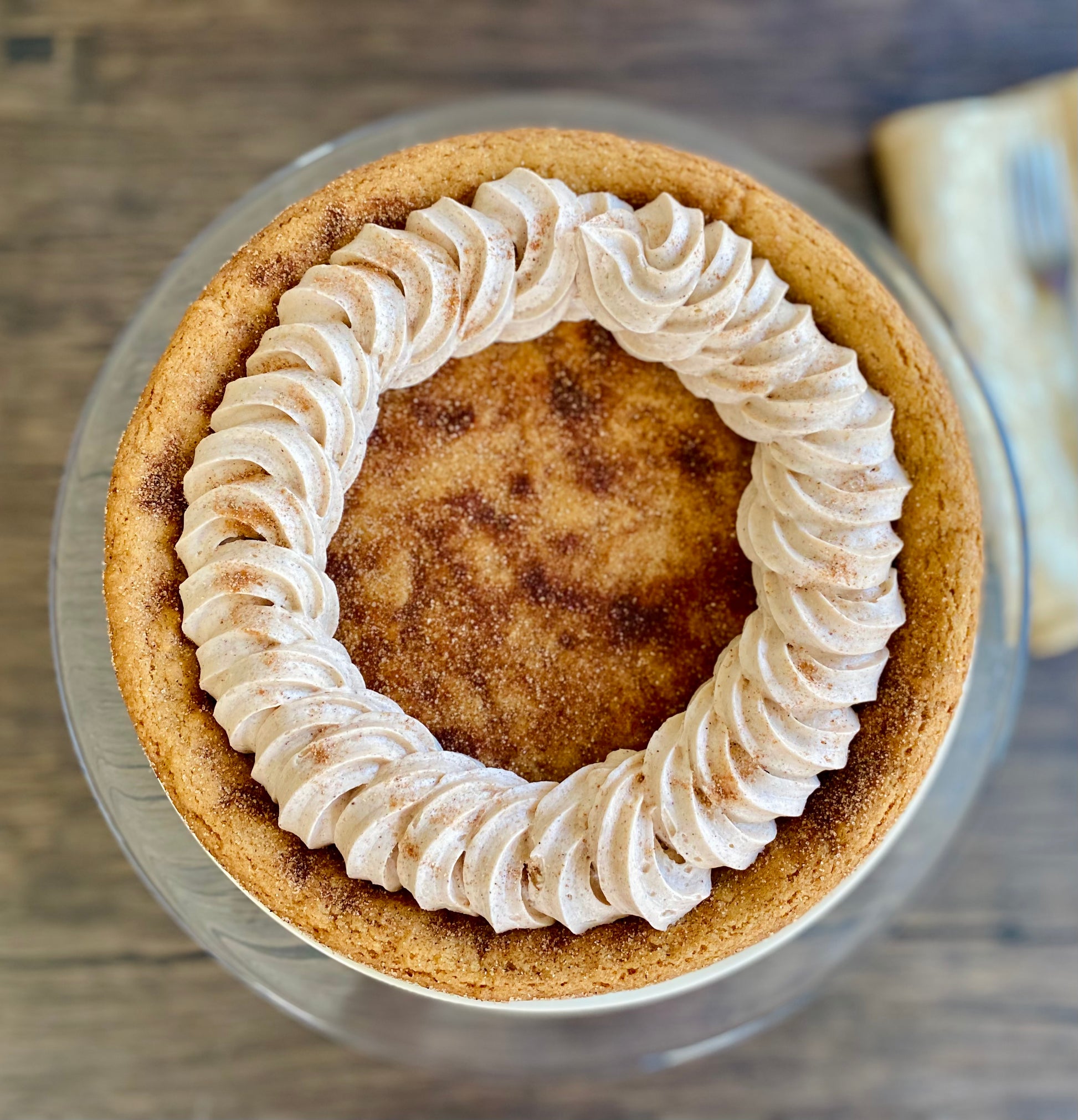Chewy Snickerdoodle cookie base topped with cinnamon sugar and Snickerdoodle buttercream. This cookie cake is great for events and gatherings!